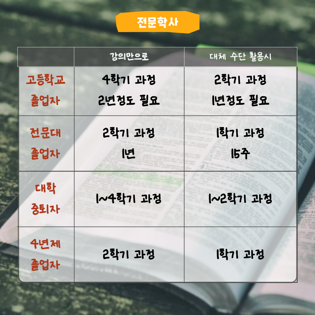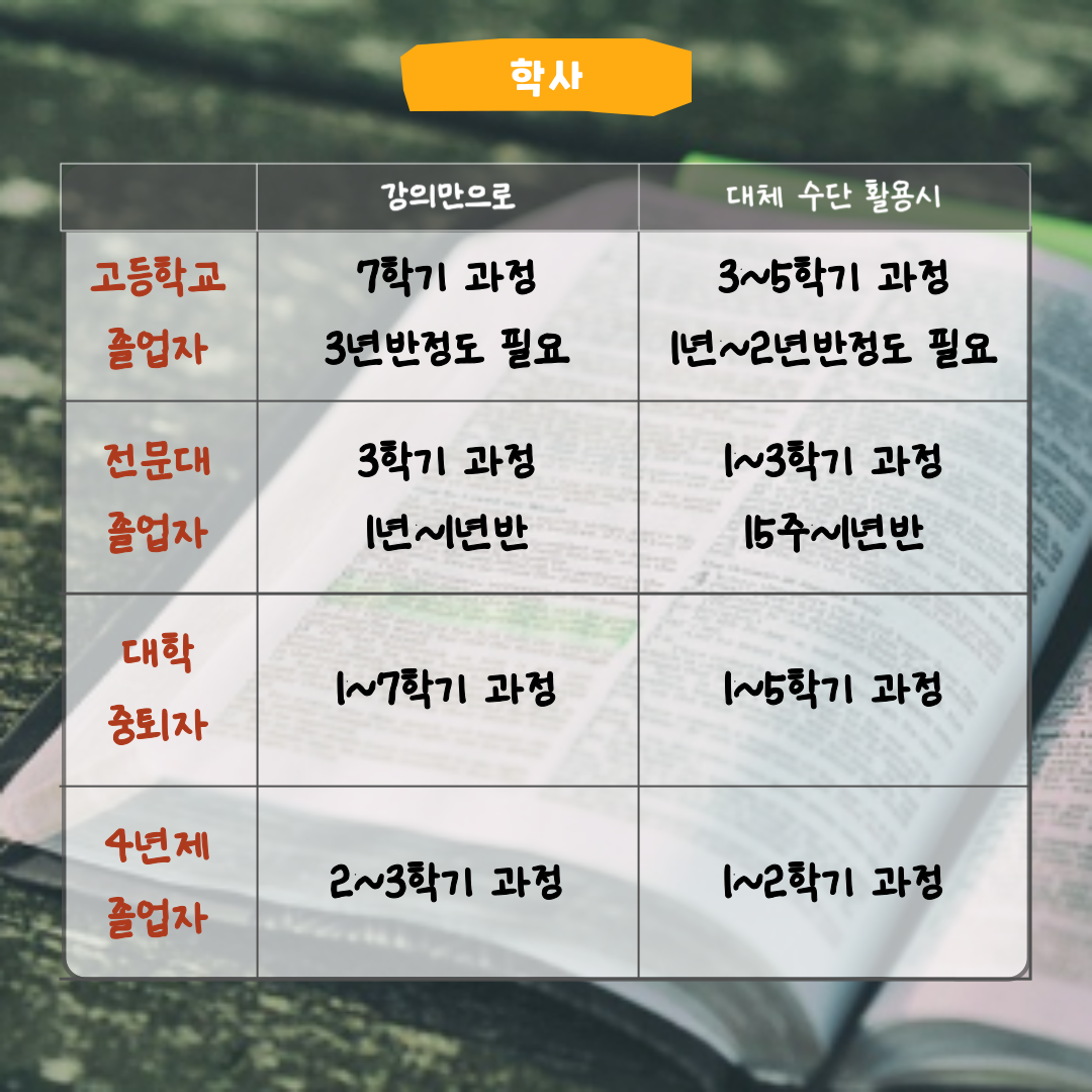 - 필요 학점을 다양한 방법으로 인정받아 빠르게 학위 취득이 가능합니다