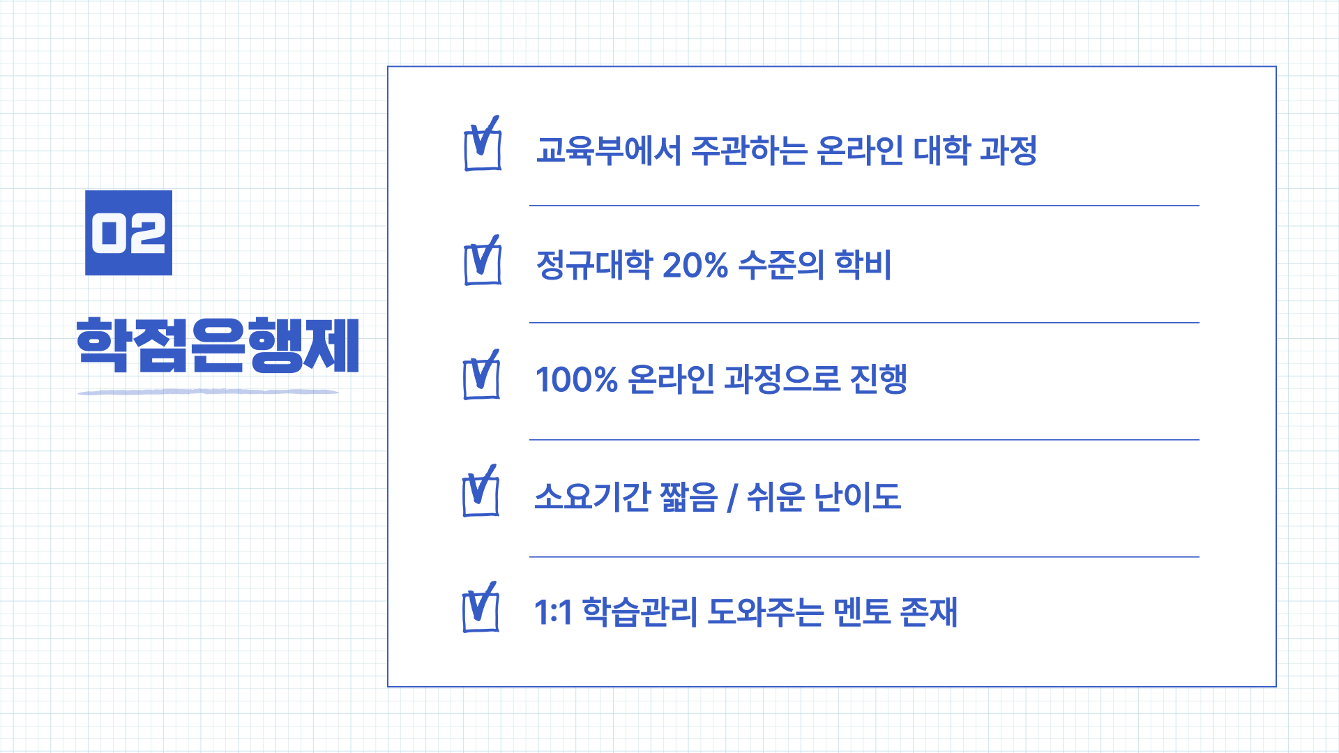 수업 외에도 다양한 방법으로 학점을 이수해 기간을 단축시킬 수 있는 장점이 있습니다