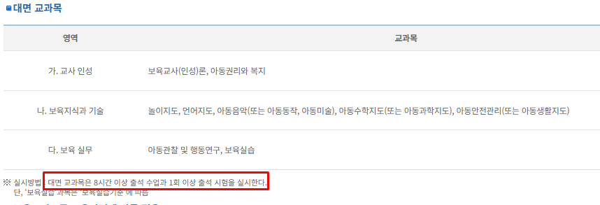 보육교사 대면과목의 경우, 광역 단위 별로 출석 장소가 운영되며,