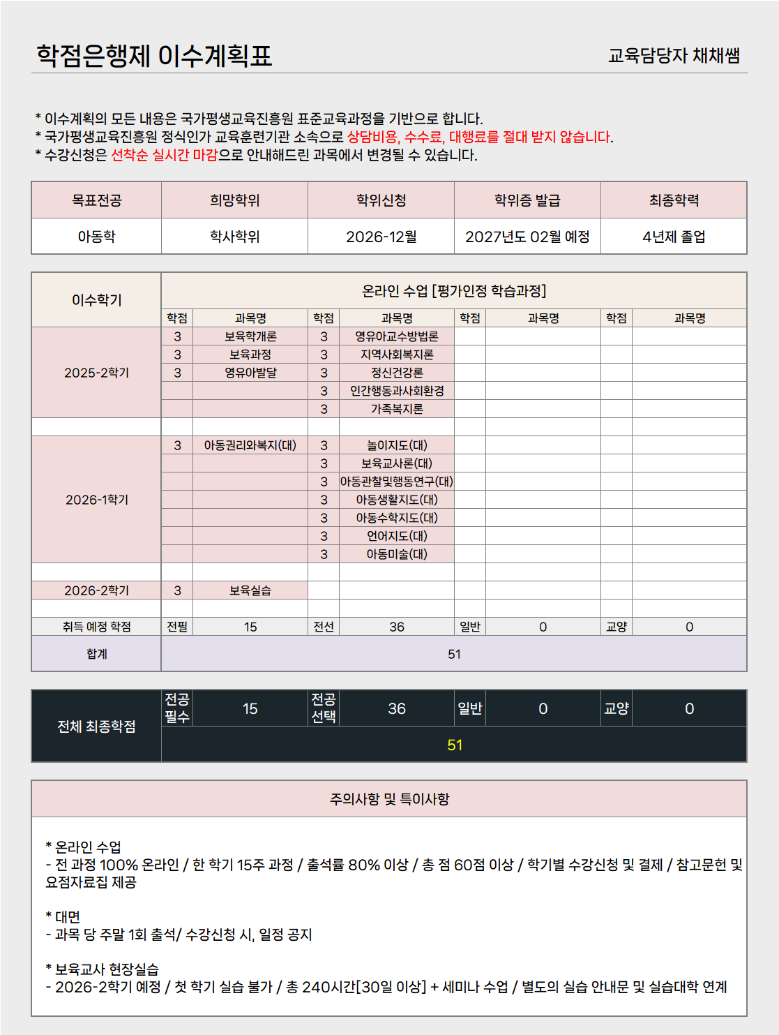 각 교과목은 1과목 당 3학점으로, 총 17과목 (51학점)을 이수하셔야 하는데요.