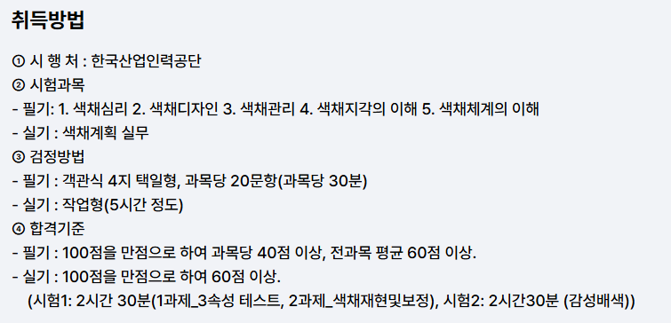 색채에 대한 전문가로, 필기 5과목 + 실기 1과목으로 평가되는데요.